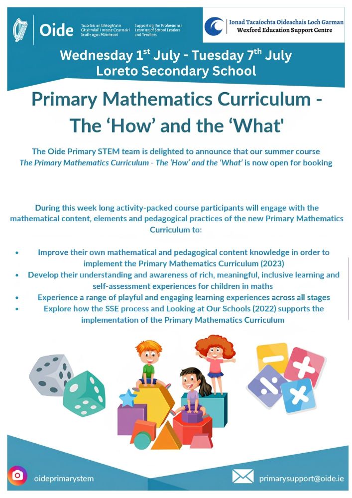 During this week long activity-packed course participants will engage with the mathematical content, elements and pedagogical practices of the new Primary Mathematics Curriculum to: Improve their own mathematical and pedagogical content knowledge in order to implement the Primary Mathematics Curriculum (2023) Develop their understanding and awareness of rich, meaningful, inclusive learning and self-assessment experiences for children in maths Experience a range of playful and engaging learning experiences across all stages Explore how the SSE process and Looking at Our Schools (2022) supports the implementation of the Primary Mathematics Curriculum