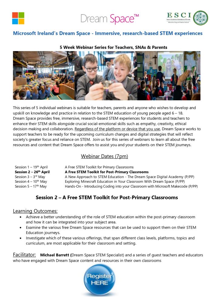 These workshops explore a range of resources that can be used to effectively develop active pupil learning in the area of STEM. They are intended to support teachers in facilitating learning in Science, Technology, Engineering and Math in the primary setting. Each webinar shares practical ideas and learning experiences to support teachers in school. The workshops coincide with national STEM weeks such as Maths Week, Science Week, Engineers Week, Code Week & Space Week.